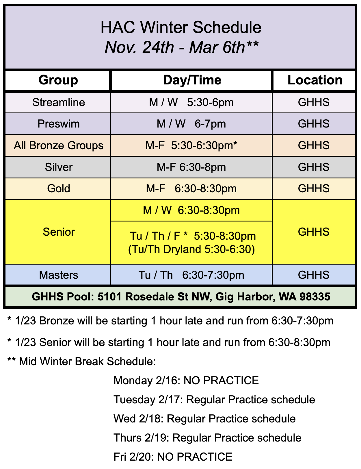 Senior $180/month: Our most elite and commited swimmers. Invite only*. Coach expects 95% participation (attendance and completing sets). Must be within 2 seconds of at least one champs time. All the criteria for gold swimmers must also be met. 7-8 practices offered a week plus 2 dryland practices, all practices recommended.
